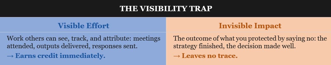 Visible effort is the work other people can see, track, and attribute to you: meetings attended, outputs delivered, responses sent.