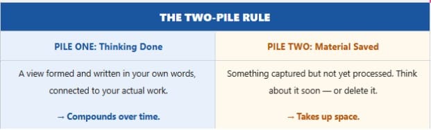 The next time you save something, ask one question: what do I think this means? If the answer is a sentence, keep the note and move it to Pile One.