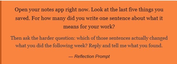 About a year ago I stopped asking “Did I capture this?” and started asking something simpler: “Did I write one sentence about what this means for something I’m currently working on?”