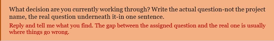 Before your next significant decision, write one sentence first: the question I am actually trying to answer here is… Not the question you were given-the real question underneath it, stated plainly.