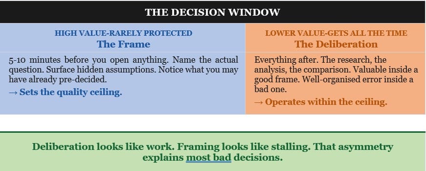 The Deliberation is everything after: the research, the analysis, the comparison. Most professionals spend nearly all their decision time in Deliberation and almost none in the Frame.