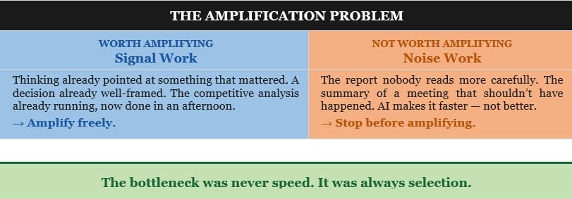 Signal work is the work worth doing faster: the competitive analysis you were already running, now completed in an afternoon rather than a week; the strategy document you’d already outlined, drafted in a single focused session instead of across three fragmented ones.