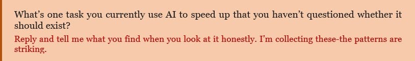 What’s one task you currently use AI to speed up that you haven’t questioned whether it should exist? Reply and tell me what you find when you look at it honestly.